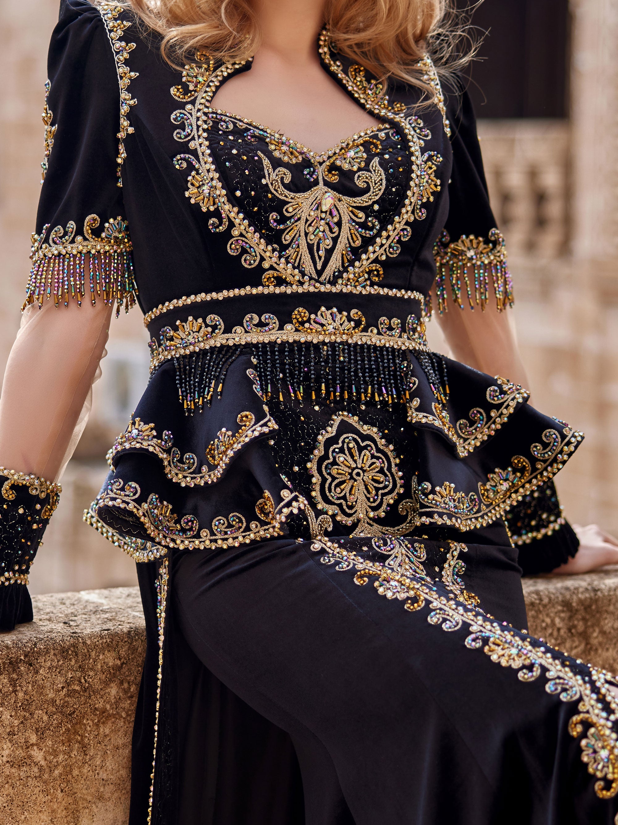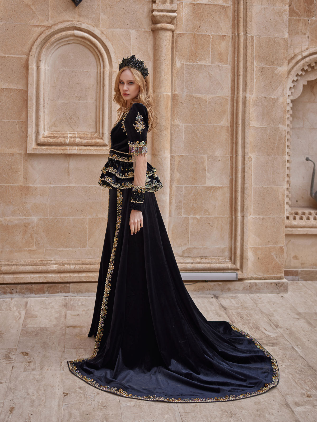 استعدي لإبداء إطلالتك بفستان حورية البحر المخملي الأسود من Bala Hatun. يتميز هذا الفستان المستوحى من الطراز العثماني بقماش مخملي أنيق وتفاصيل فريدة مثل الأكمام الوهمية وفتحة العنق على شكل قلب وخصر مكشكش وشق أمامي. يضيف ذيل الفستان الطويل لمسة درامية بينما تضيف الزخارف الذهبية والترتر والخرز لمسة من التألق. هذا الفستان البسيط والأنيق مثالي لأي مناسبة خاصة.