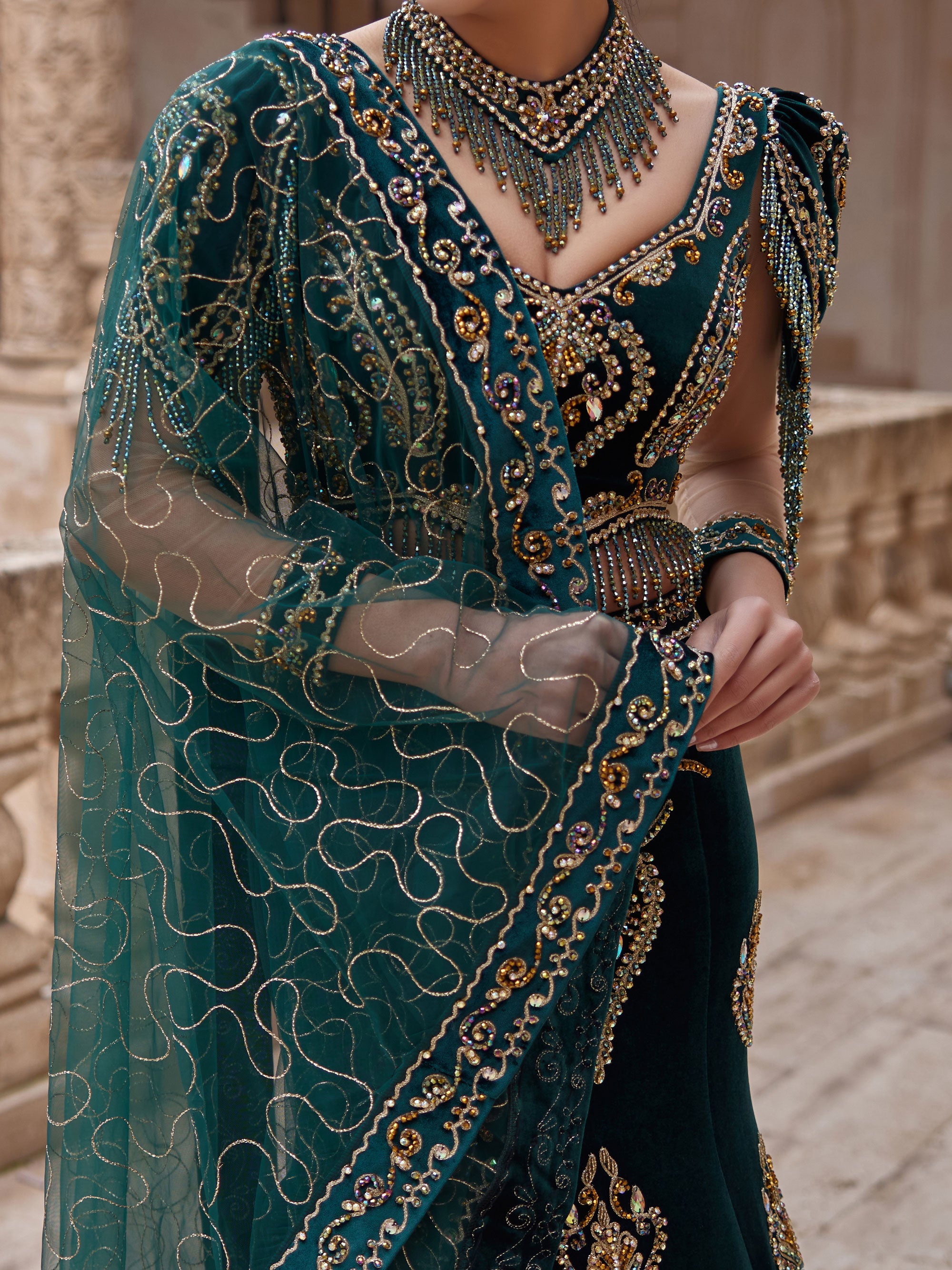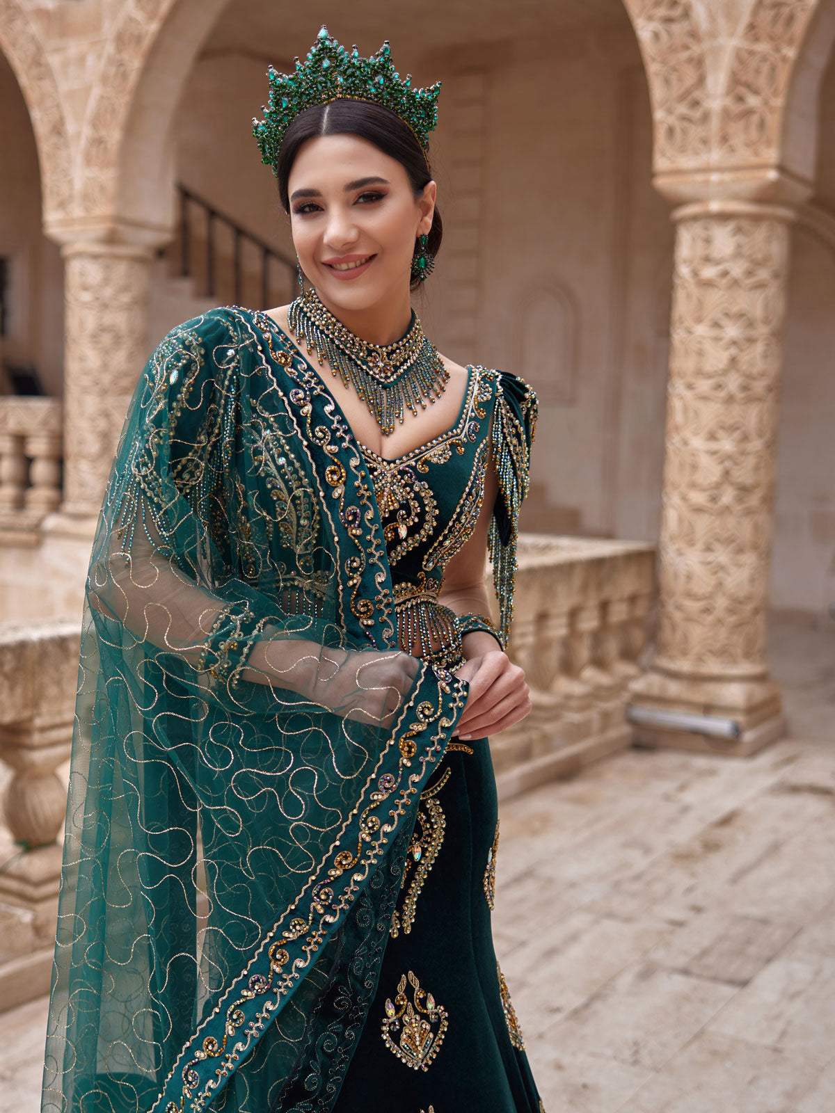 اشعري وكأنك من أفراد العائلة المالكة بارتداء فستان الحفلات الجميل المصنوع من المخمل الأخضر المزين بالزهور! يتميز هذا الفستان العصري والأنيق بخرزات هامشية مذهلة وأكمام على شكل زهرة التوليب وفتحة رقبة على شكل حرف V. تصميم حورية البحر والزخارف الزهرية يجعله مثاليًا لحفلات الحناء أو أي مناسبة عصرية. كوني أجمل الحاضرين بارتداء هذا الفستان للحفلات!
