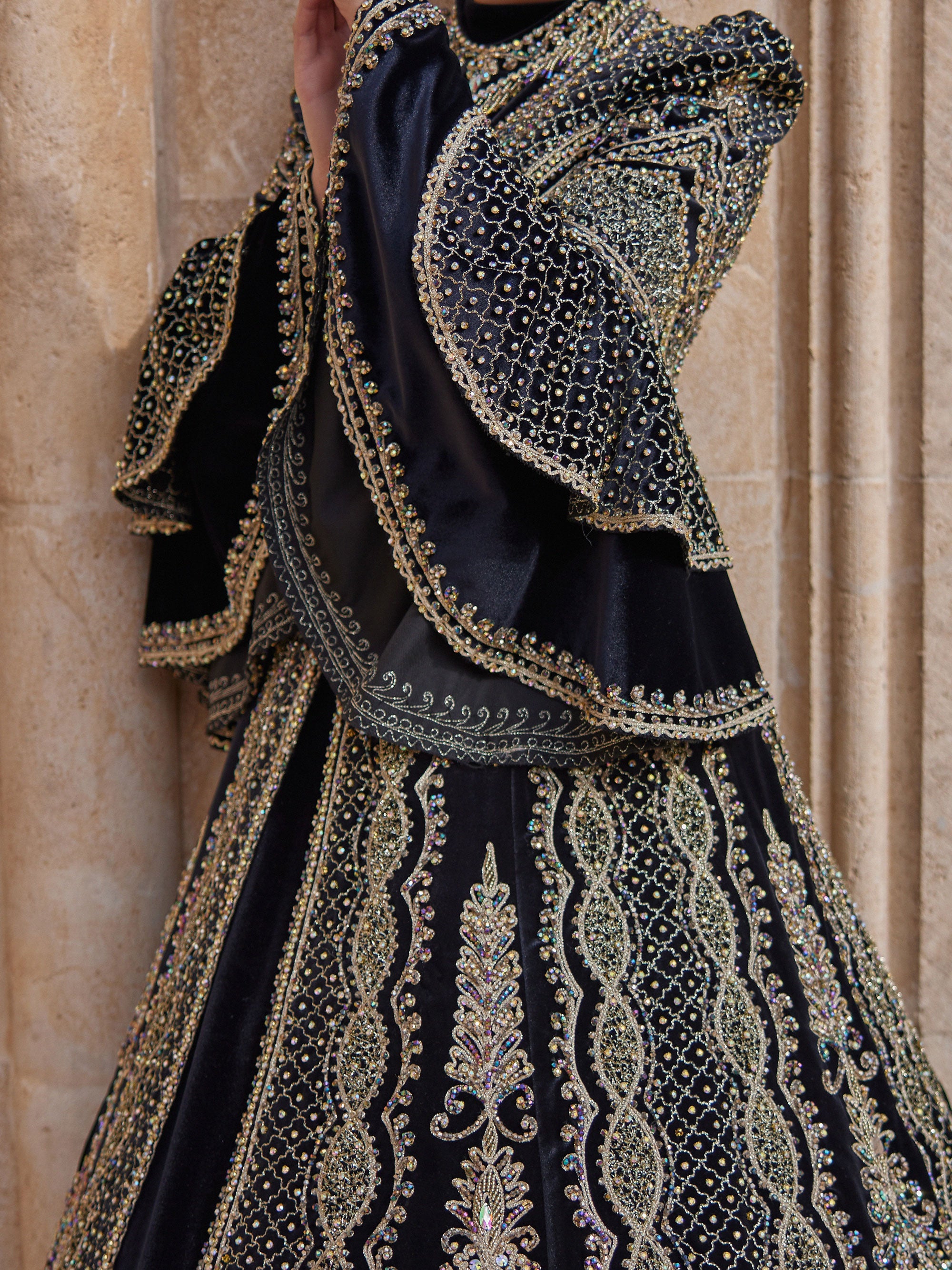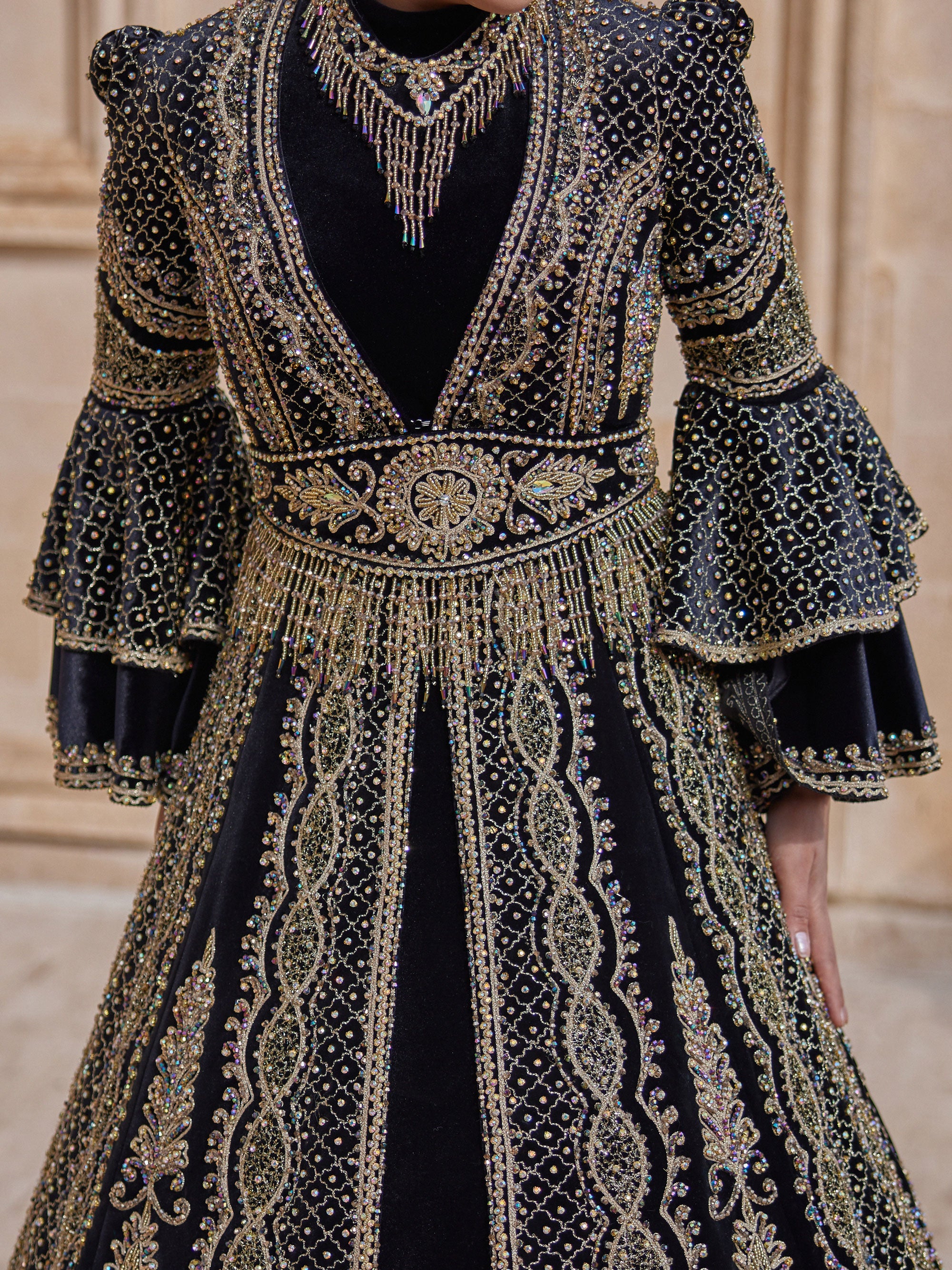 كوني محط الأنظار في يومك المميز مع هذا الفستان الأسود المخملي. تضفي الزخارف الذهبية الثقيلة والتطريز المعقد على الفستان لمسة أنيقة. مع الأكمام الطويلة متعددة الطبقات وتصميم يصل إلى الأرض، من المؤكد أن هذا القفطان الإسلامي المزين بالحناء سيثير إعجابك. يأتي الفستان مع قلادة من الخرز اليدوي وحزام مزين بالشراشيب وقماش الحجاب. كما يمكن ارتداء الفستان الأسود المخملي الطويل ذو الرقبة العالية أسفل القفطان الفاخر في مناسبات مختلفة.