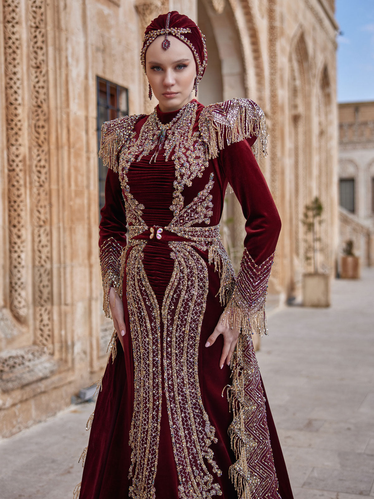 Make a statement at your next event with our elegant Burgundy Gold Lace Applique Mermaid Dress. The intricate sequin and fringe beadings add a touch of modernity to this formal henna kaftan dress. Perfect for Islamic women with long sleeves and a detachable train for versatility. Upgrade your hijab wardrobe with this stylish and luxurious option.