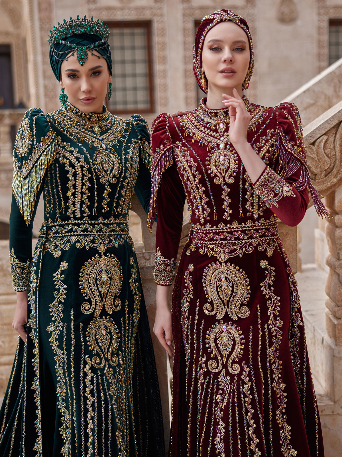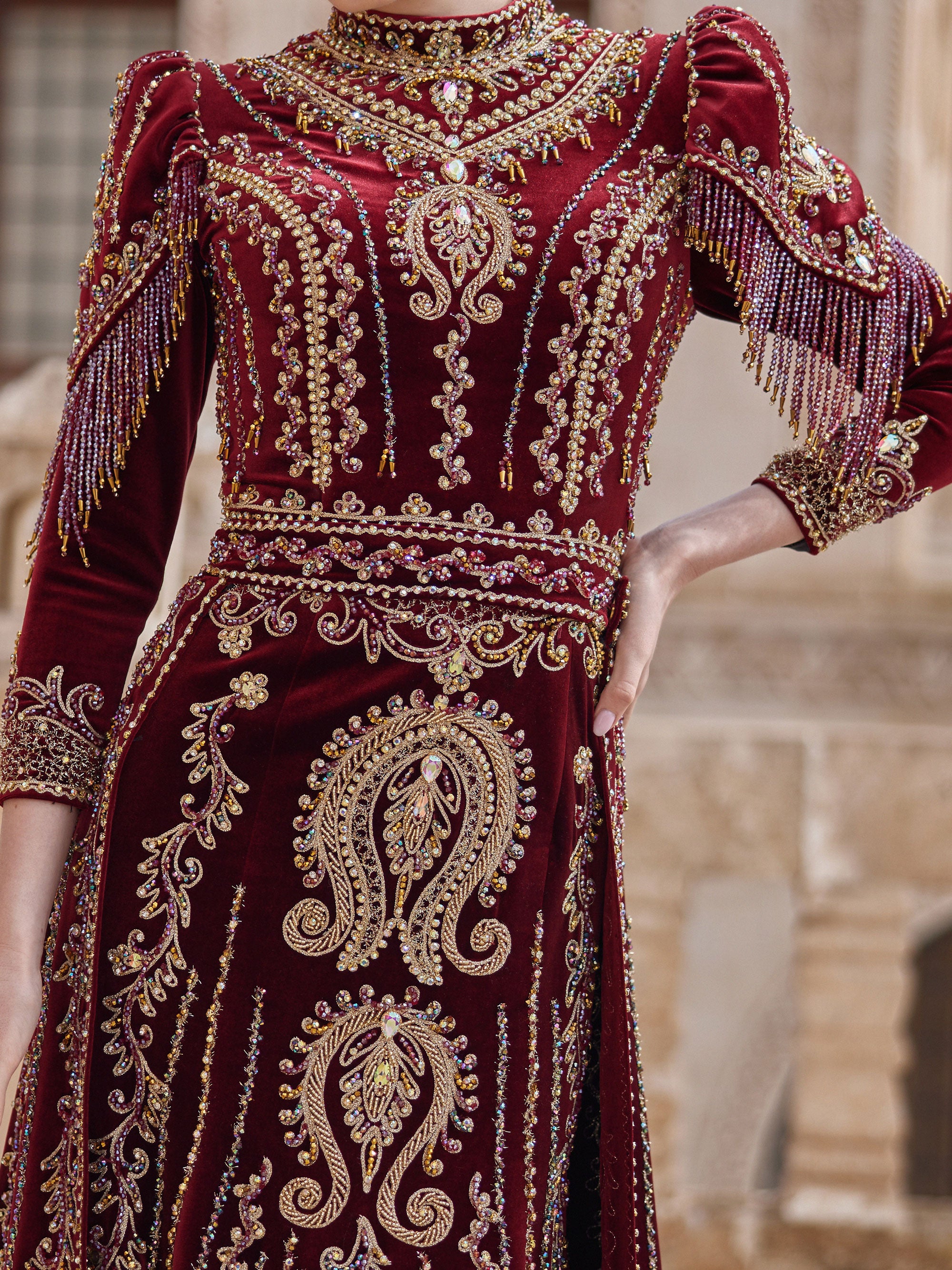 This beautiful burgundy red velvet dress is the epitome of luxury for Muslim women. The heavy embroidery, gold embellishments, and detachable chapel train add elegant touches to the long mermaid design. With long sleeves and a turtle neck, this dress is perfect for stylish brides looking for a fancy yet modest option.