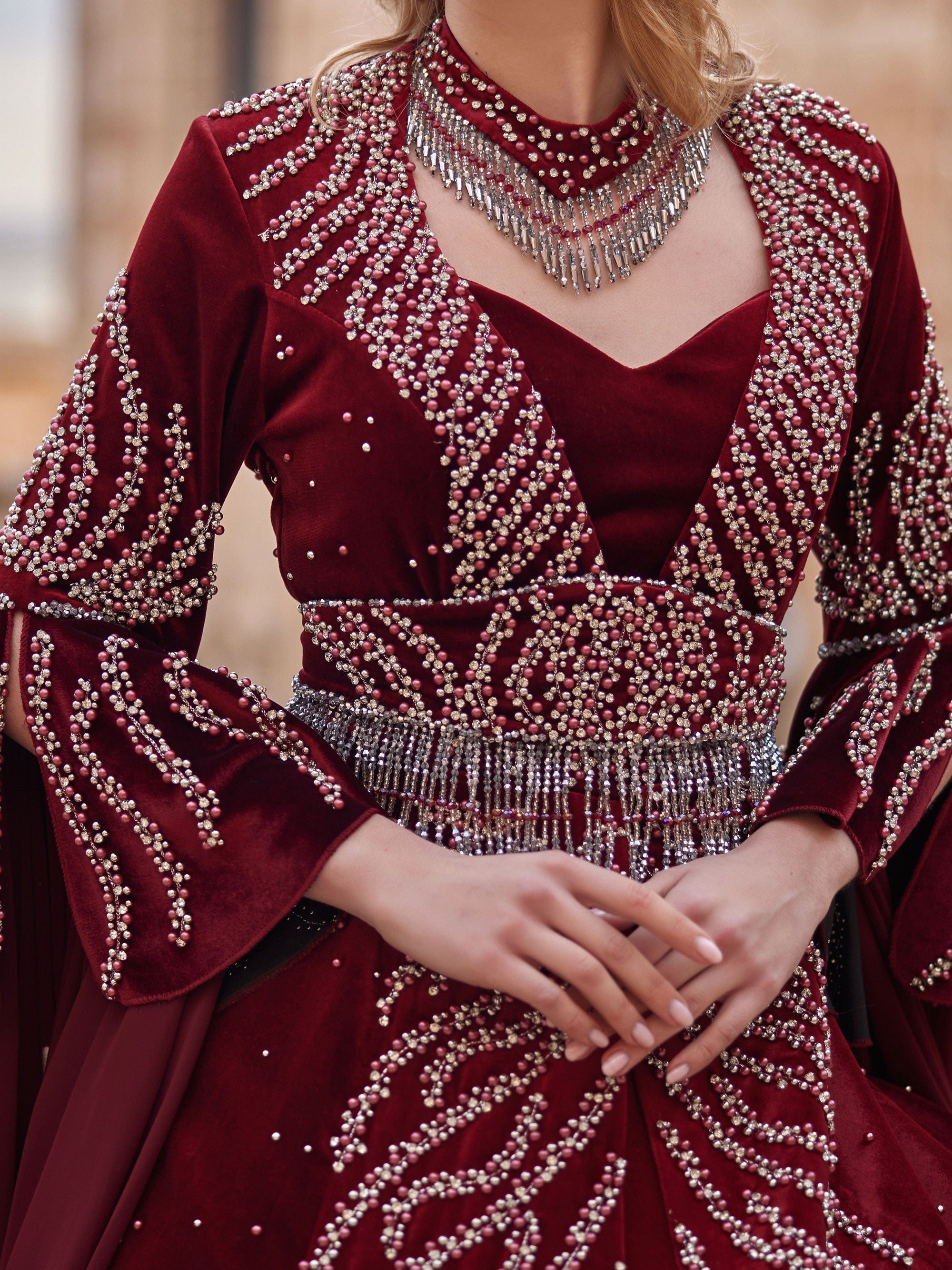 Experience the elegance and chicness of our Elegant Chic Maroon Velvet Long Floral Beaded Henna Night Kaftan Gown. This floor length gown features a flattering sweetheart neck and long sleeves adorned with delicate floral beading. The luxurious velvet fabric and intricate bead fringes add a touch of glamour to this minimalist kaftan gown. Perfect for any formal occasion with its pieces, this gown is sure to turn heads and make you feel like the elegant and confident woman you are.