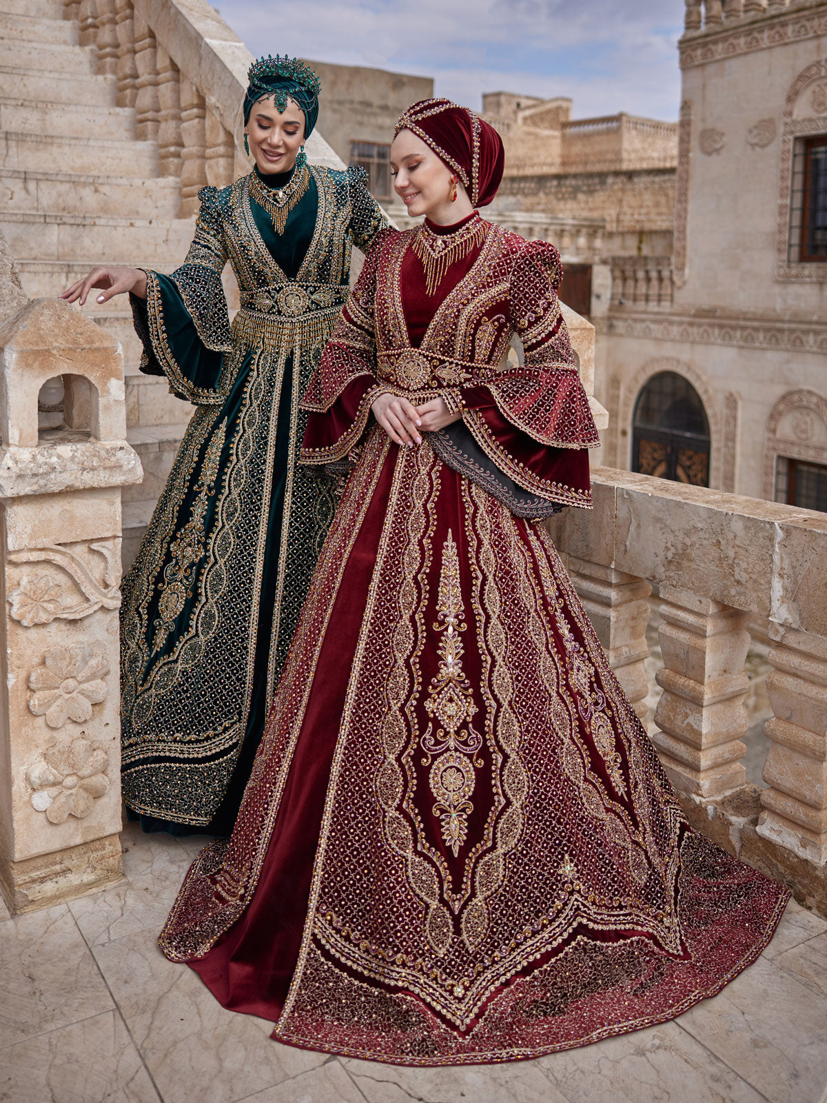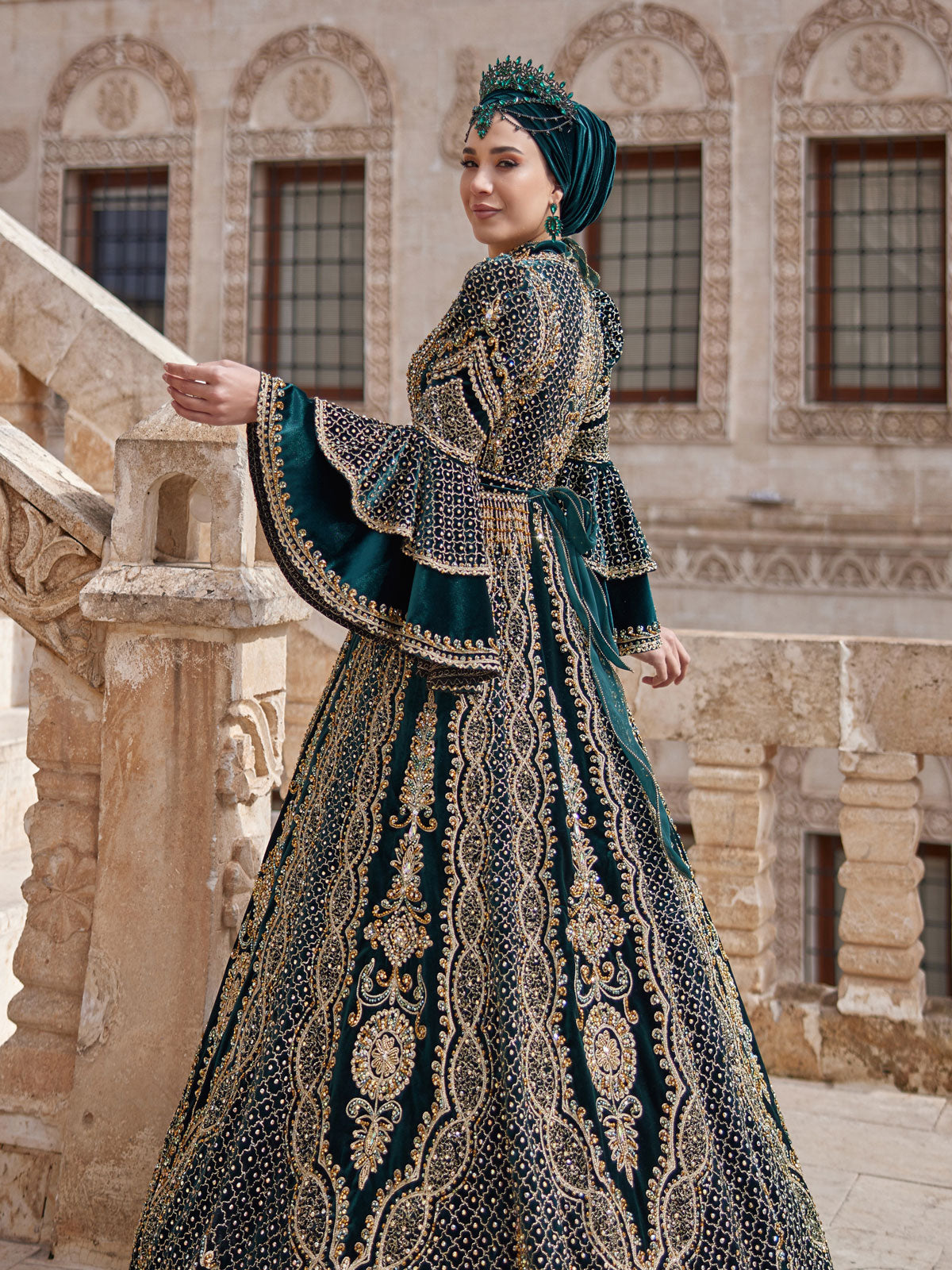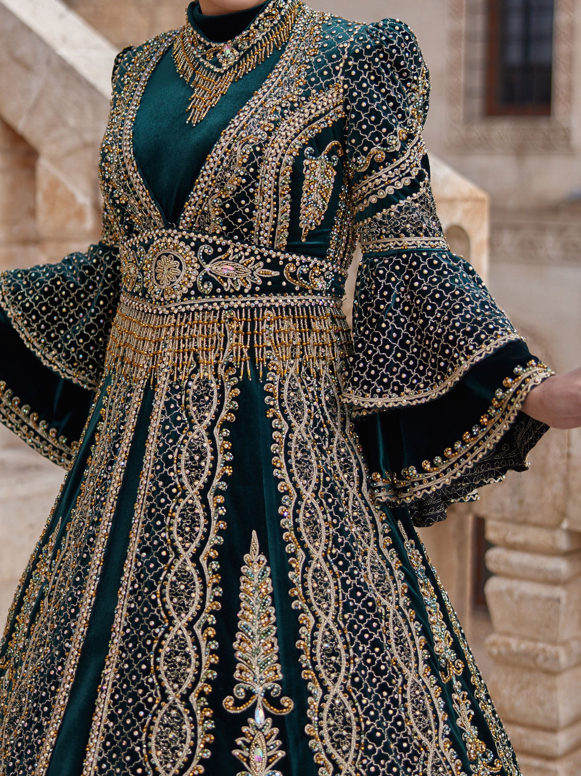 Get ready to turn heads with our Luxury Green Turtle Neck A Line Kaftan! The stunning green and gold embroidered design, along with shiny gold applique and heavy elegant embellishments, will make you feel like royalty. With frill sleeves and beaded details, this kaftan exudes luxury and elegance. Indulge in the ultimate henna party style!