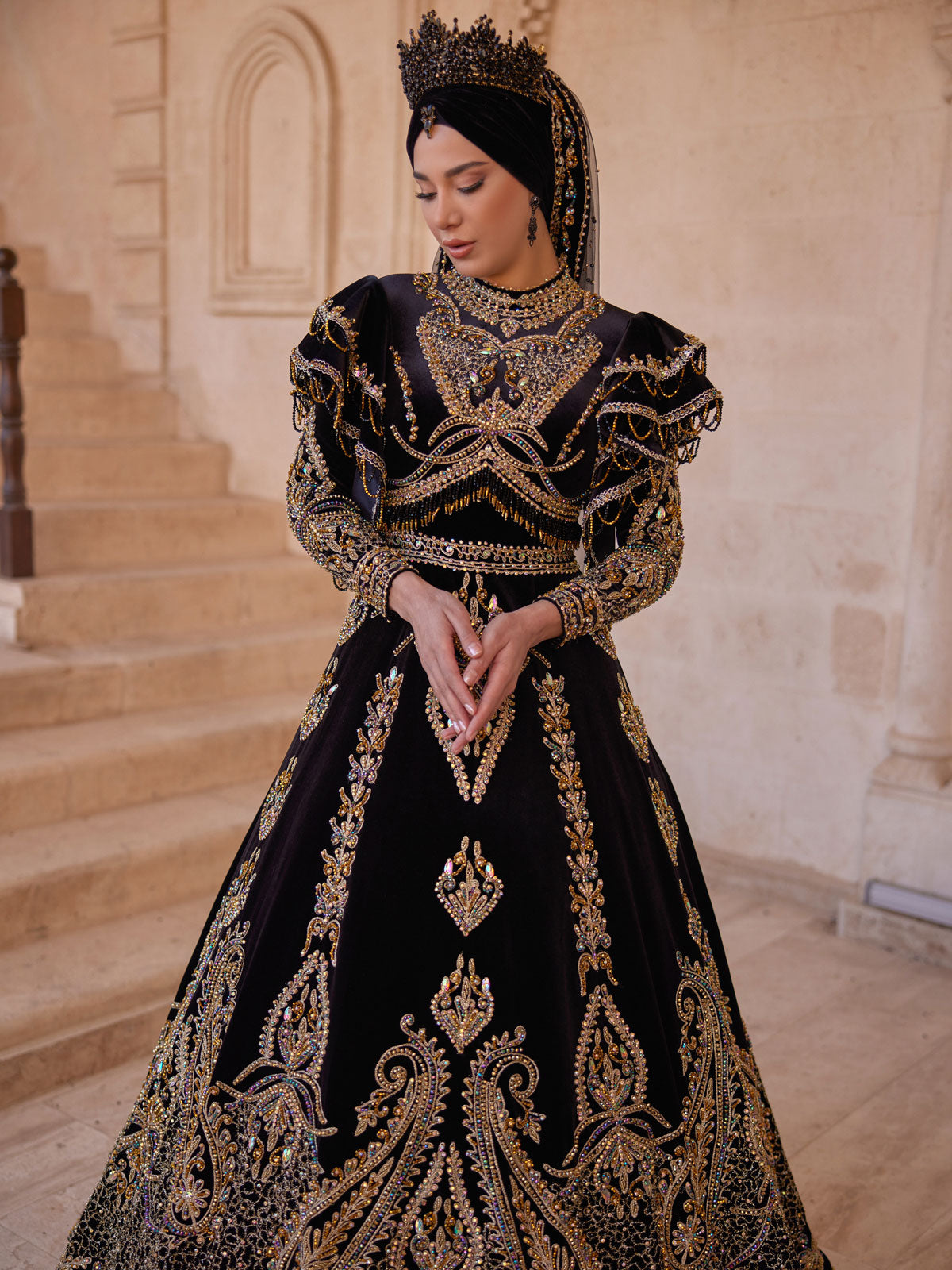 Indulge in the elegance of this Ottoman Islamic Black Gold Embellished A Line Hijab Henna Party Gown. This luxurious hijab gown features stunning gold beaded and sequin embellishments, inspired by Ottoman style embroidery. The flattering A-line silhouette and frill details make this black dress the perfect choice for any elegant occasion. Elevate your wardrobe with this tasteful and exclusive piece.