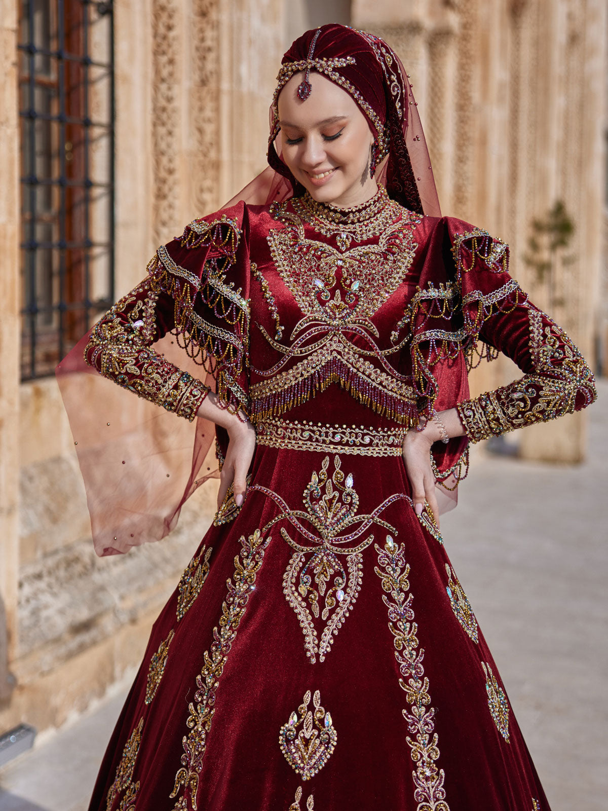 Introducing our Red Gold Heavy Embroidered A Line Muslim Kaftan Gown! This luxurious piece features exquisite burgundy and gold embroidery, embellished long sleeves and hemlines, and elegant ruffle and turtle neck details. With beaded fringes, it adds a touch of opulence to any occasion. Elevate your style game and feel confidently chic in this one-of-a-kind piece.
