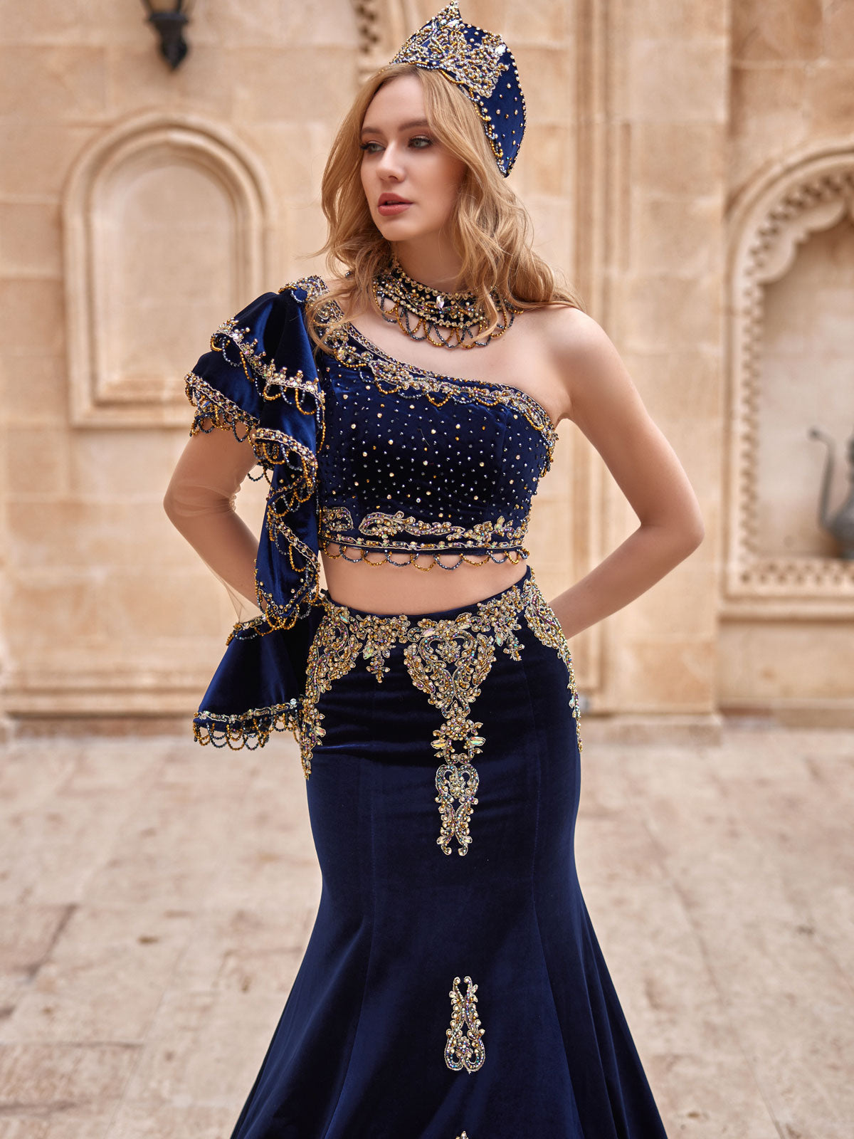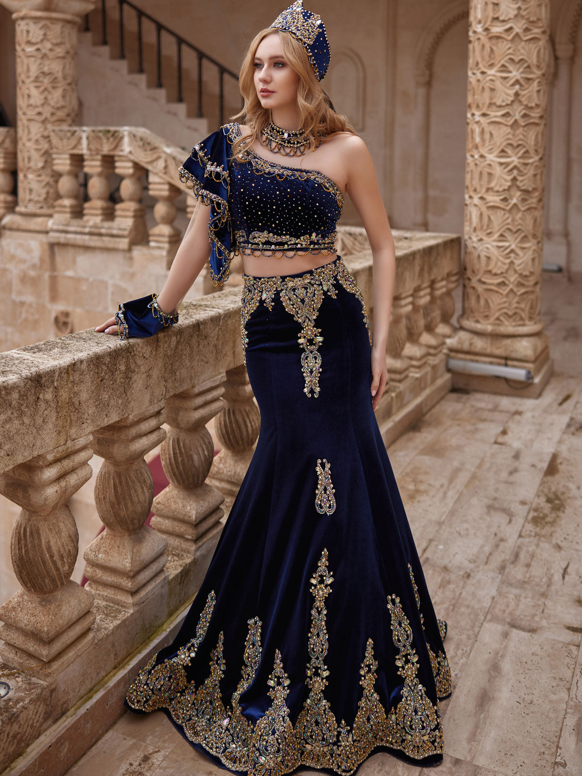 Be the center of attention in this trendy and chic Royal Blue One Shoulder Two Piece Velvet Cocktail Party Mermaid Dress. The velvet and sequin embellishments add a touch of luxury, while the illusion sleeve adds a touch of luxury. Embellished crop top and long fancy beaded sequined mermaid skirt with chapel train fits perfectly. Perfect for special occasions or cocktail parties, this dress is sure to make you feel fancy and stylish.
